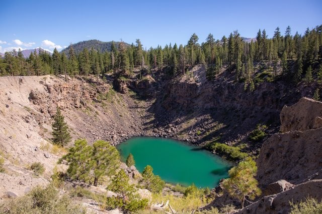 Six hundred years ago, a massive explosion heated rock and ground water, causing a large blast zone. Three craters were formed. Today, snow melt and rainwater create emerald green pools in the craters. Accessibility: 1.4 miles (2.25 km) round-trip uphill hiking trail. Directions: From the Mammoth Scenic Loop follow signs to Inyo Craters. Take 1.3 mile (2km) unpaved road to trailhead.