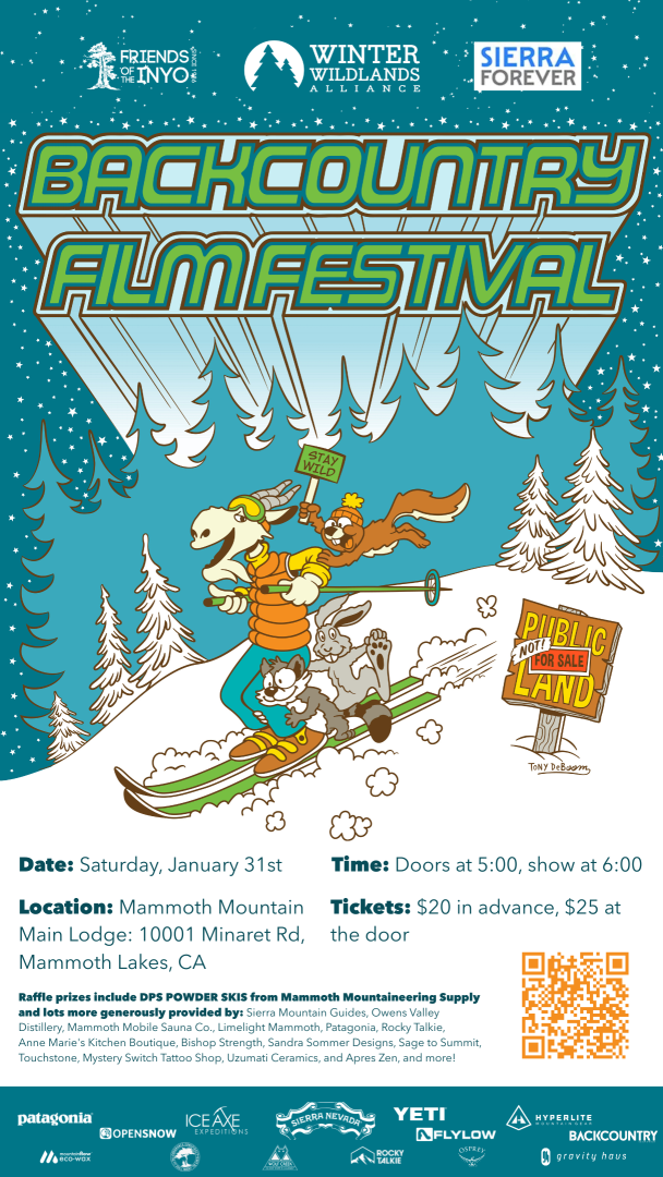 The 21st Annual Backcountry Film Festival (BCFF) returns to Mammoth on January 31st, 2026 at Mammoth Mountain’s Main Lodge, bringing a celebration of human-powered adventure, winter storytelling, and public lands advocacy to our community. Featuring a line-up of inspiring and action-packed films, plus an awesome raffle, tables from local organizations and supporting businesses to check out, light snacks and a cash bar. Join us for an evening of fun and community, with all proceeds supporting Eastern Sierra SnowSchool.