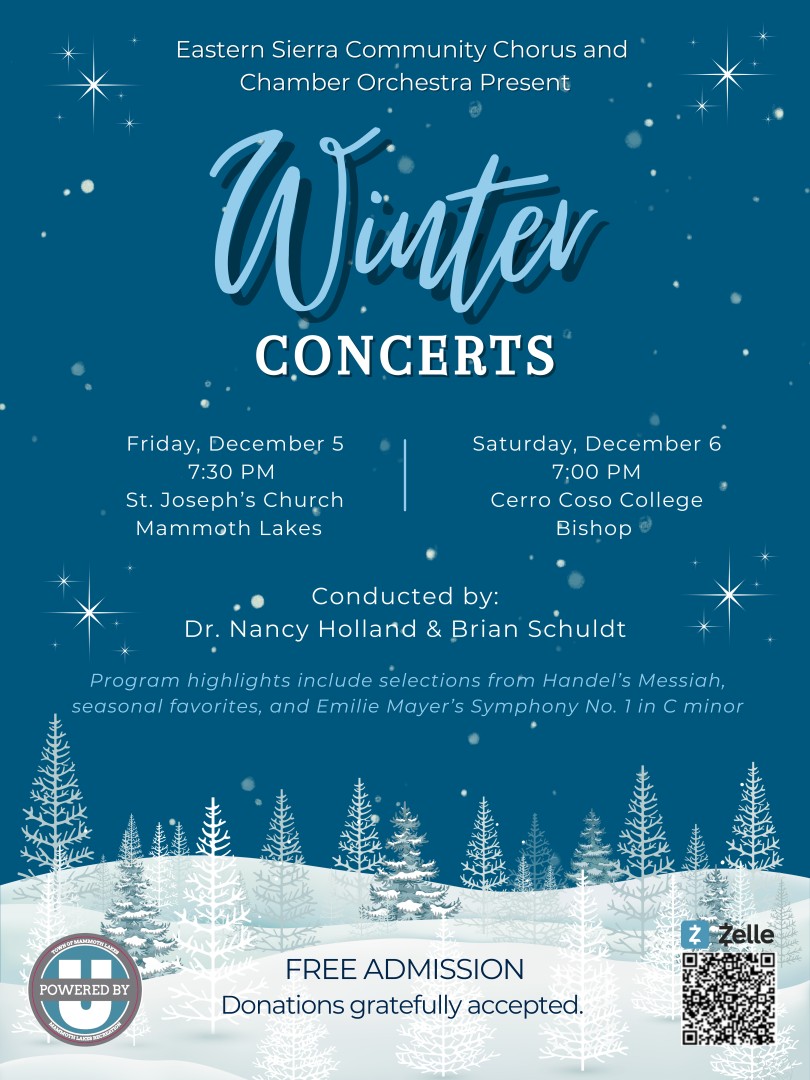 At our Winter Concerts Dec 5 & 6 this year, we will be performing Holiday favorites, including selections from the Messiah along with the Eastern Sierra Chamber Orchestra, conducted by Brian Schuldt. We have 45 singers in the chorus, and with the orchestra, there will be over 80 musicians on stage.