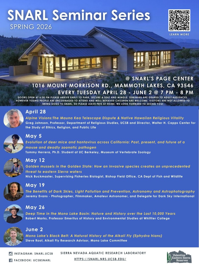 Please join us this spring for a series of presentations focused on some of the latest research and findings from the Eastern Sierra and Beyond. We are very excited to be in person again at the Page Center. Seminars are on Tuesday evenings from 7-8 PM and doors open at 6:30. All seminars will be held in the Page Center at SNARL – 1016 Mount Morrison Road. Small tasters of food and drink will be provided by local businesses. Please arrive early to park, secure a seat, snack and mingle. Seminars are geared to adult audiences, however young people are encouraged to attend and well-behaved children are welcome. Visitors are not allowed to bring dogs to SNARL, so please leave pets at home. Looking forward to seeing you at SNARL. https://snarl.nrs.ucsb.edu/visiting/adult-education/seminar-series/